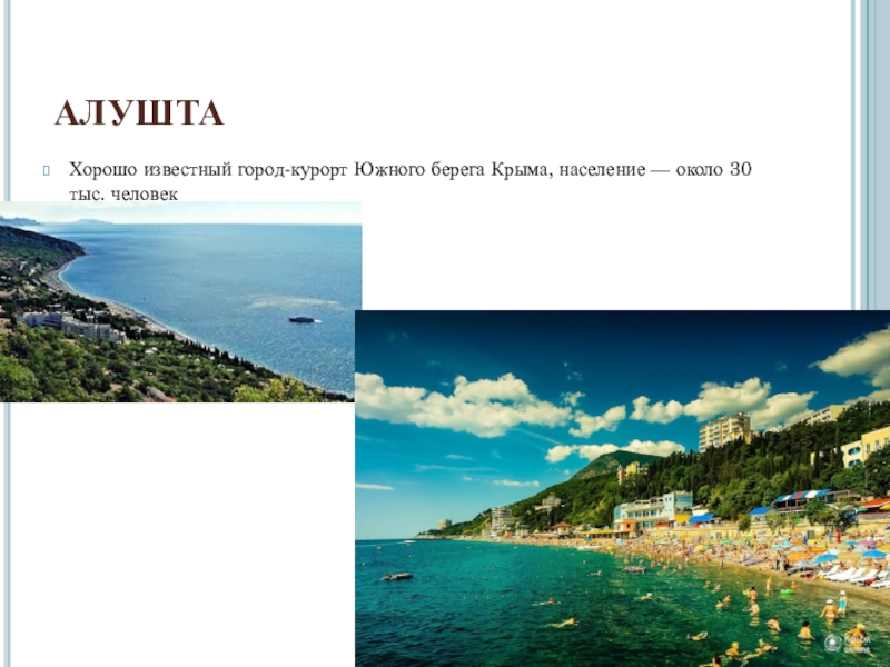 АЛУШТАХорошо известный город-курорт Южного берега Крыма, население — около 30 тыс. человек