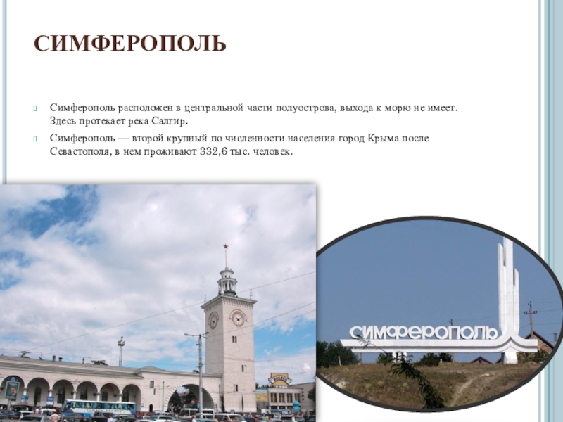 СИМФЕРОПОЛЬ Симферополь расположен в центральной части полуострова, выхода к морю не имеет. Здесь протекает река Салгир.Симферополь —