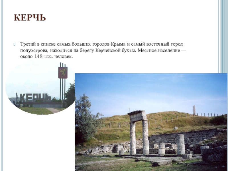 КЕРЧЬ Третий в списке самых больших городов Крыма и самый восточный город полуострова, находится на берегу Керченской бухты. Местное население —