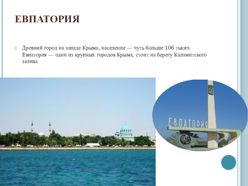 ЕВПАТОРИЯ Древний город на западе Крыма, население — чуть больше 106 тысяч. Евпатория — один из крупных