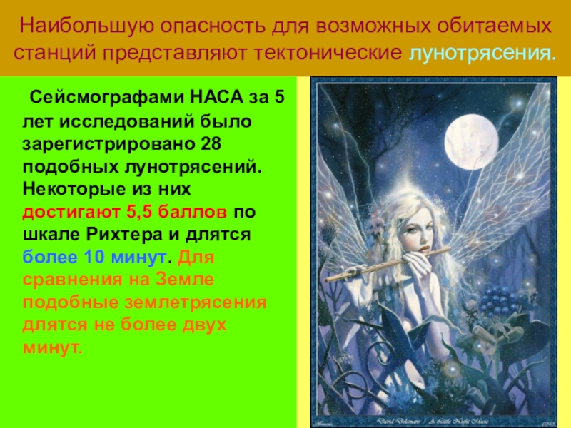 Слайд 30Наибольшую опасность для возможных обитаемых станций представляют тектонические лунотрясения.