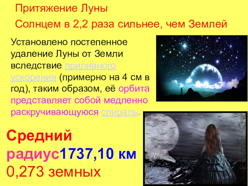 от Земли вследствие приливного ускорения (примерно на 4 см в год), таким образом, её орбита представляет собой медленно раскручивающуюся спираль.