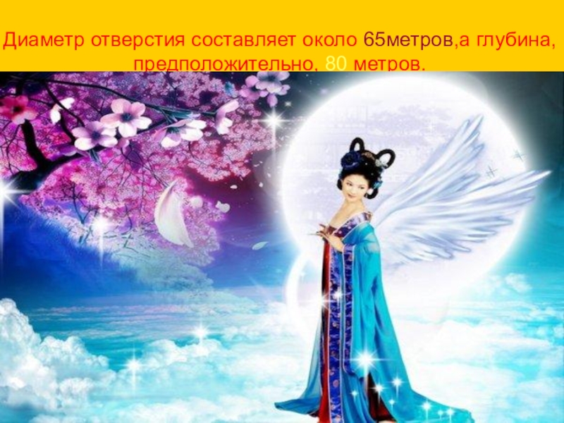 Слайд 26Диаметр отверстия составляет около 65метров,а глубина, предположительно, 80 метров.