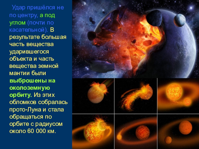В результате большая часть вещества ударившегося объекта и часть вещества земной мантии были выброшены на околоземную орбиту. Из этих обломков собралась прото-Луна и стала обращаться по орбите с радиусом около 60 000 км.