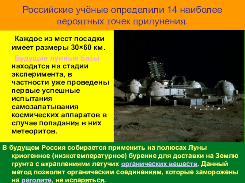Слайд 55Российские учёные определили 14 наиболее вероятных точек прилунения.