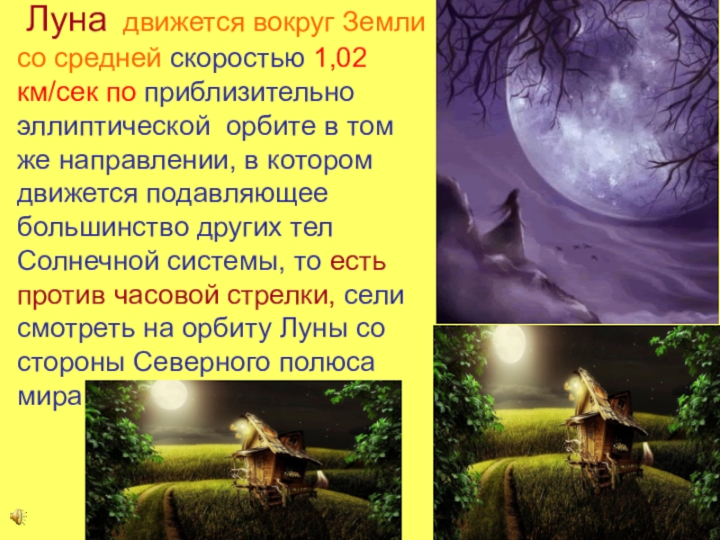 приблизительно эллиптической орбите в том же направлении, в котором движется подавляющее большинство других тел Солнечной системы, то есть против часовой стрелки, сели смотреть на орбиту Луны со стороны Северного полюса мира.