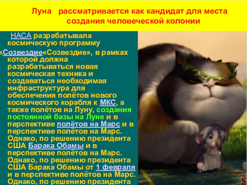 «Созвездие«Созвездие», в рамках которой должна разрабатываться новая космическая техника и создаваться необходимая инфраструктура для обеспечения полётов нового космического корабля к МКС, а также полётов на Луну, создания постоянной базы на Луне и в перспективе полётов на Марс и в перспективе полётов на Марс. Однако, по решению президента США Барака Обамы и в перспективе полётов на Марс. Однако, по решению президента США Барака Обамы от 1 февраля и в перспективе полётов на Марс. Однако, по решению президента США Барака Обамы от 1 февраля 2010 года, финансирование программы в 2011 году было прекращено.