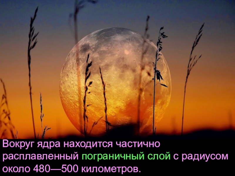 Слайд 41Вокруг ядра находится частично расплавленный пограничный слой с радиусом около 480—500