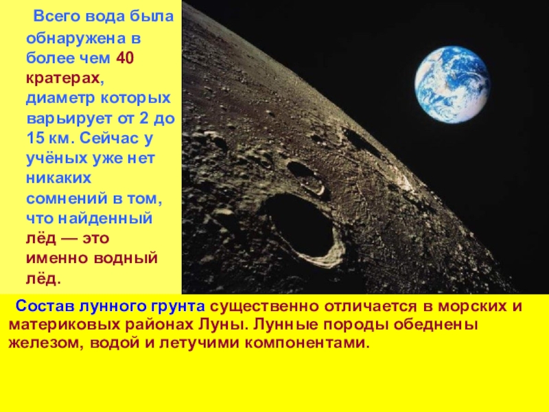 Слайд 35 Всего вода была обнаружена в более чем 40 кратерах, диаметр которых