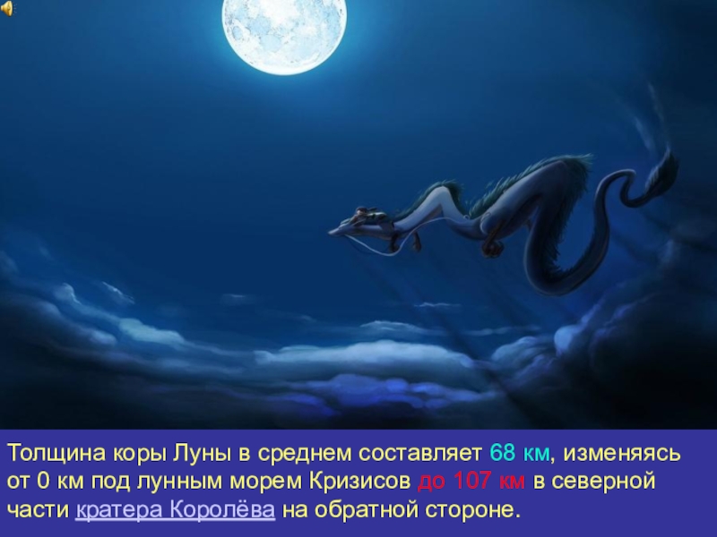 Слайд 18Толщина коры Луны в среднем составляет 68 км, изменяясь от 0 км под
