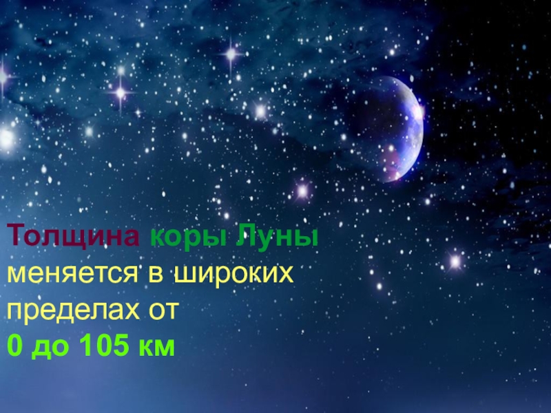 Слайд 13Толщина коры Луны меняется в широких пределах от