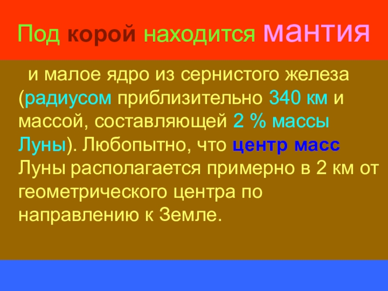 приблизительно 340 км и массой, составляющей 2 % массы Луны). Любопытно, что центр масс Луны располагается примерно в 2 км от геометрического центра по направлению к Земле.