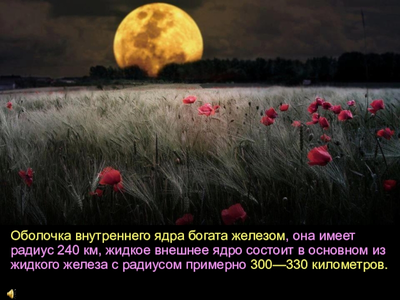 Слайд 40Оболочка внутреннего ядра богата железом, она имеет радиус 240 км, жидкое внешнее