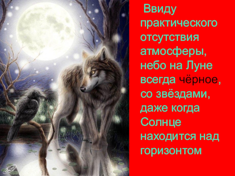 Слайд 15 Ввиду практического отсутствия атмосферы, небо на Луне всегда чёрное, со звёздами,