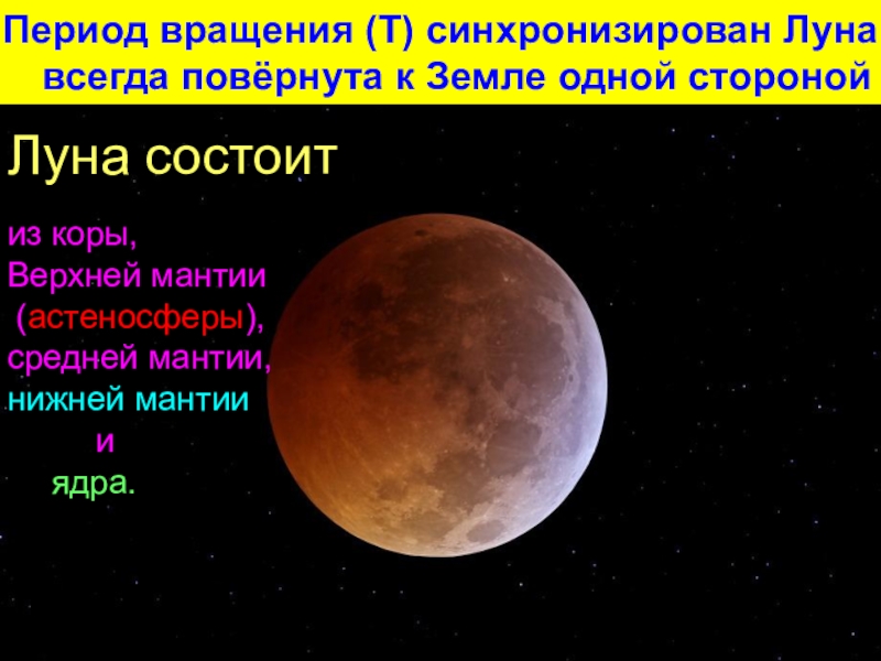 Слайд 10Период вращения (Т) синхронизирован Луна всегда повёрнута к Земле одной стороной