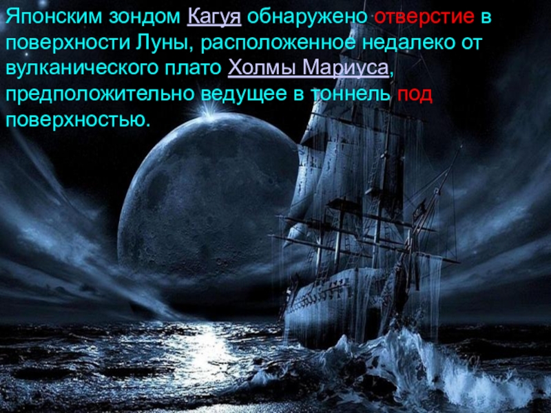 Слайд 25Японским зондом Кагуя обнаружено отверстие в поверхности Луны, расположенное недалеко от