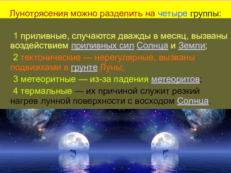 4 термальные — их причиной служит резкий нагрев лунной поверхности с восходом Солнца.