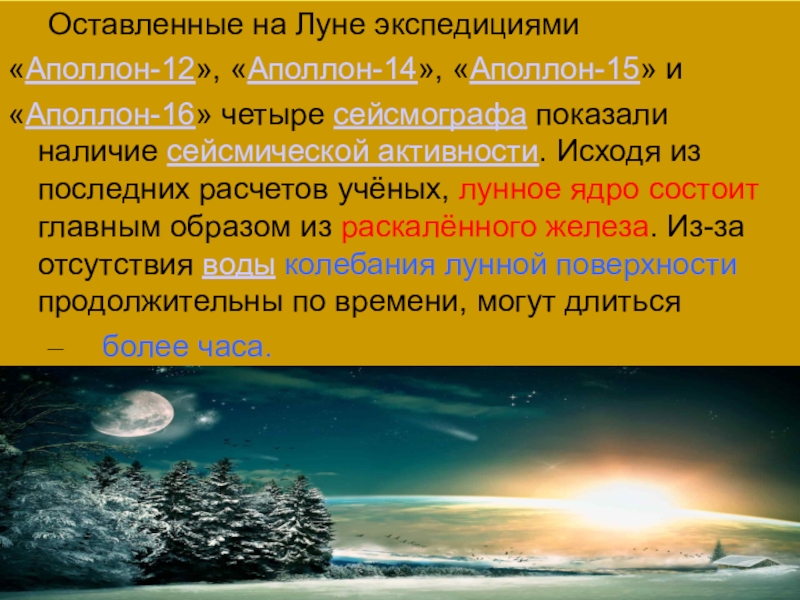 показали наличие сейсмической активности. Исходя из последних расчетов учёных, лунное ядро состоит главным образом из раскалённого железа. Из-за отсутствия воды колебания лунной поверхности продолжительны по времени, могут длиться