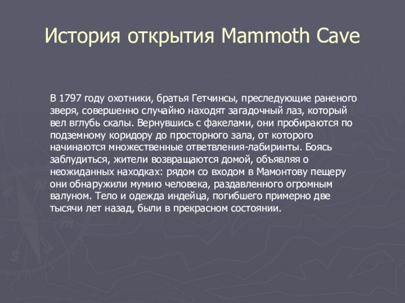 История открытия Mammoth Cave В 1797 году охотники, братья Гетчинсы, преследующие раненого зверя, совершенно случайно находят загадочный