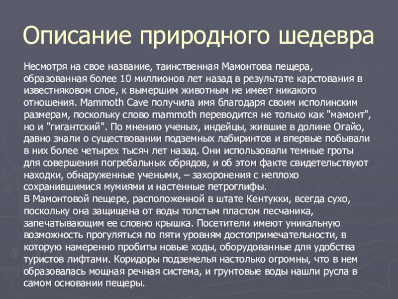 10 миллионов лет назад в результате карстования в известняковом слое, к вымершим животным не имеет никакого отношения. Mammoth Cave получила имя благодаря своим исполинским размерам, поскольку слово mammoth переводится не только как "мамонт", но и "гигантский". По мнению ученых, индейцы, жившие в долине Огайо, давно знали о существовании подземных лабиринтов и впервые побывали в них более четырех тысяч лет назад. Они использовали темные гроты для совершения погребальных обрядов, и об этом факте свидетельствуют находки, обнаруженные учеными, – захоронения с неплохо сохранившимися мумиями и настенные петроглифы.