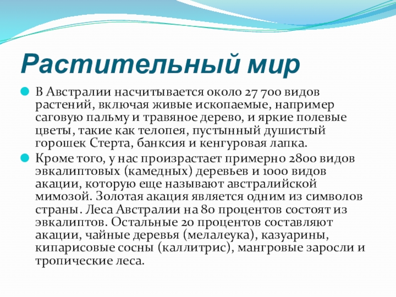 Кроме того, у нас произрастает примерно 2800 видов эвкалиптовых (камедных) деревьев и 1000 видов акации, которую еще называют австралийской мимозой. Золотая акация является одним из символов страны. Леса Австралии на 80 процентов состоят из эвкалиптов. Остальные 20 процентов составляют акации, чайные деревья (мелалеука), казуарины, кипарисовые сосны (каллитрис), мангровые заросли и тропические леса.