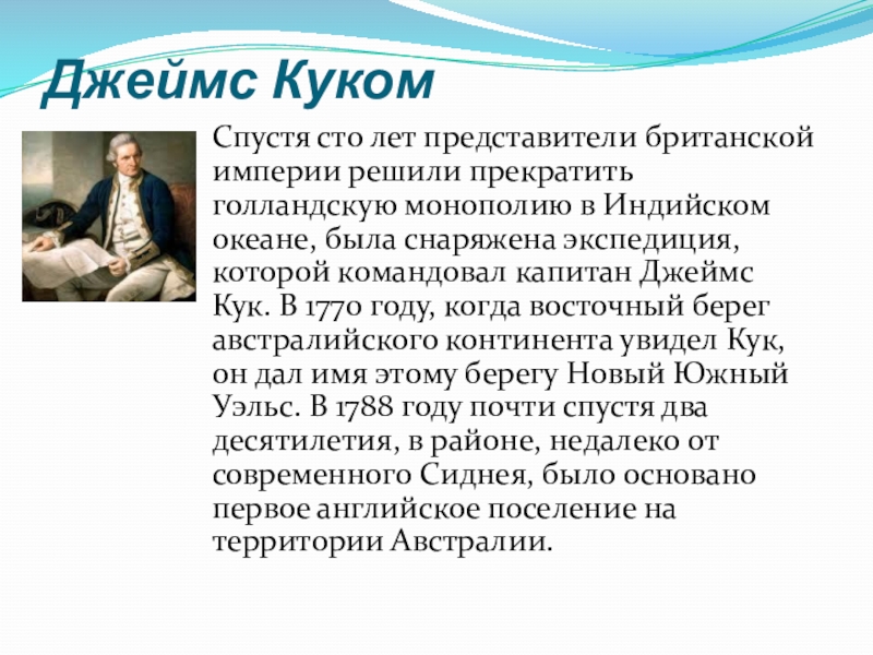 в Индийском океане, была снаряжена экспедиция, которой командовал капитан Джеймс Кук. В 1770 году, когда восточный берег австралийского континента увидел Кук, он дал имя этому берегу Новый Южный Уэльс. В 1788 году почти спустя два десятилетия, в районе, недалеко от современного Сиднея, было основано первое английское поселение на территории Австралии.