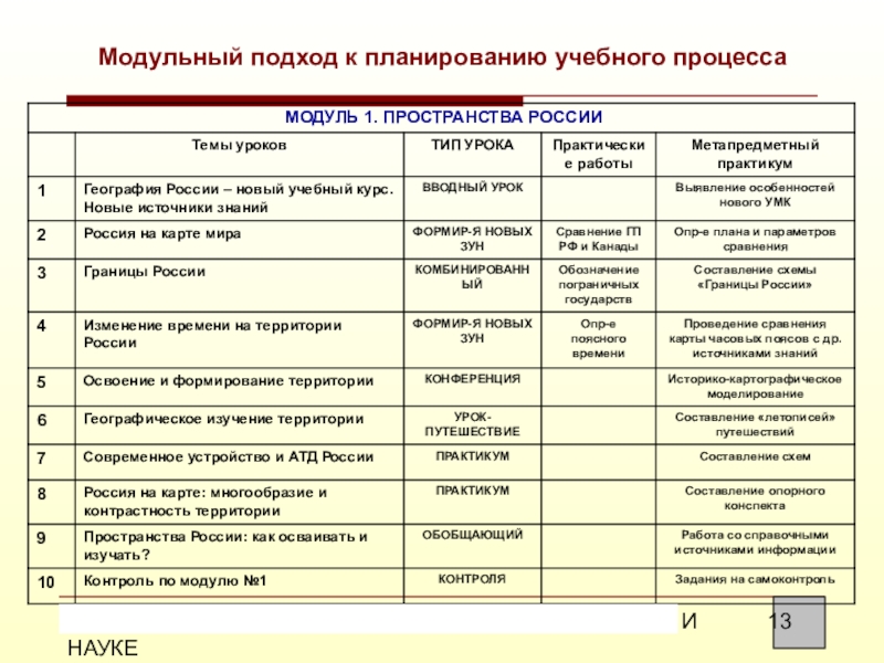 Выделение в календарно-тематическом планировании учебных модулей (модуль ориентирован на отработку и соверш-е ОУ)