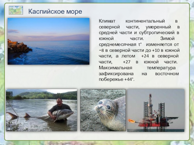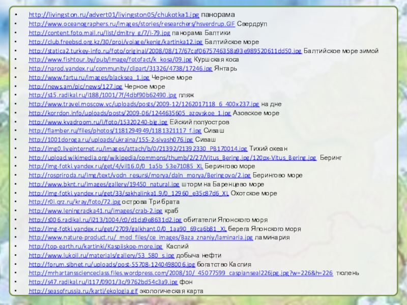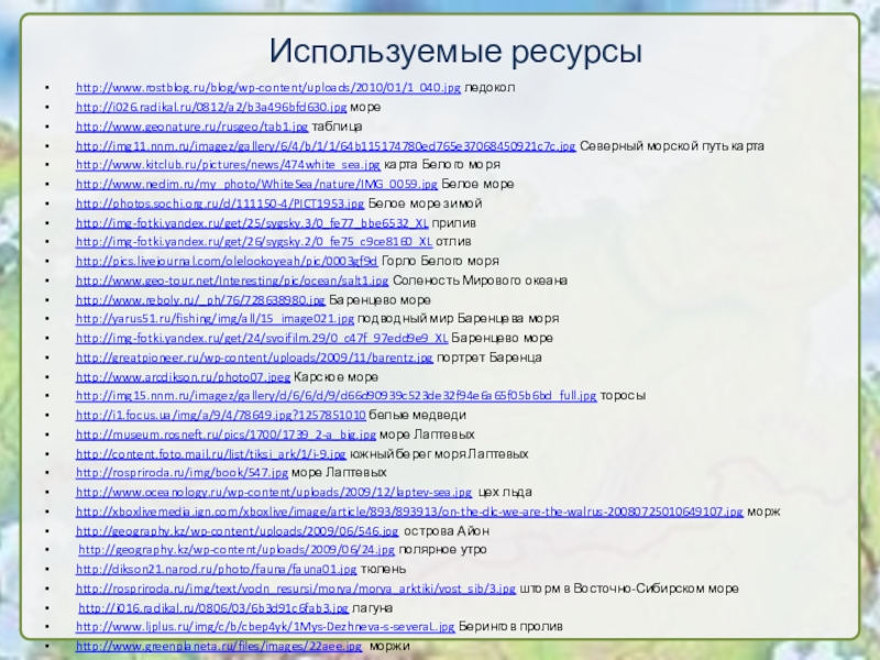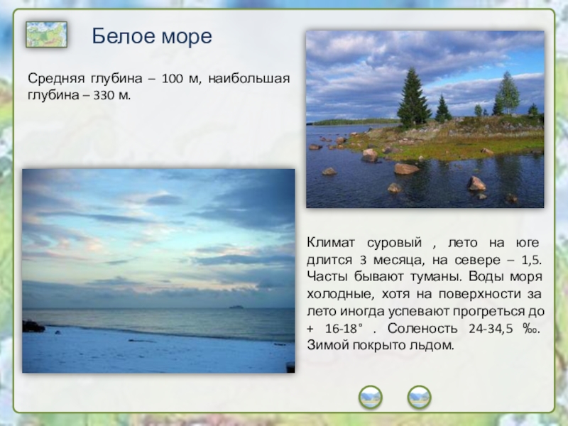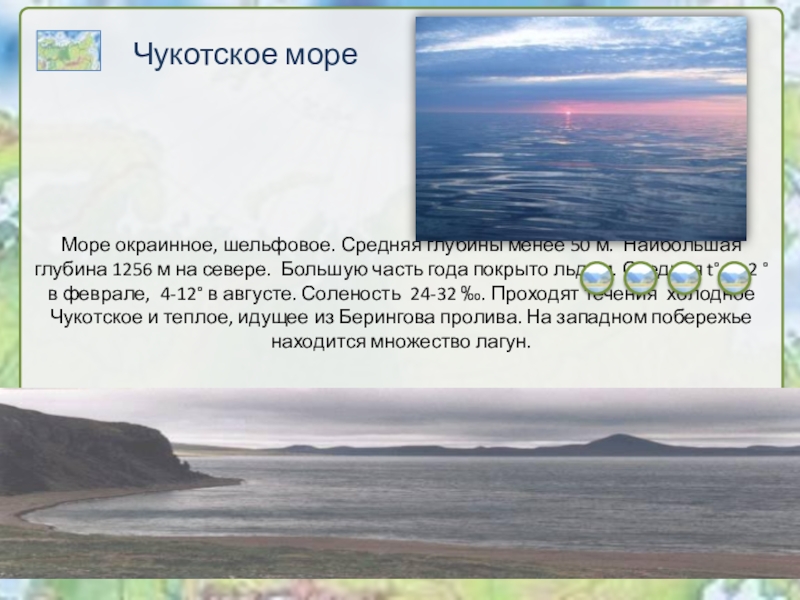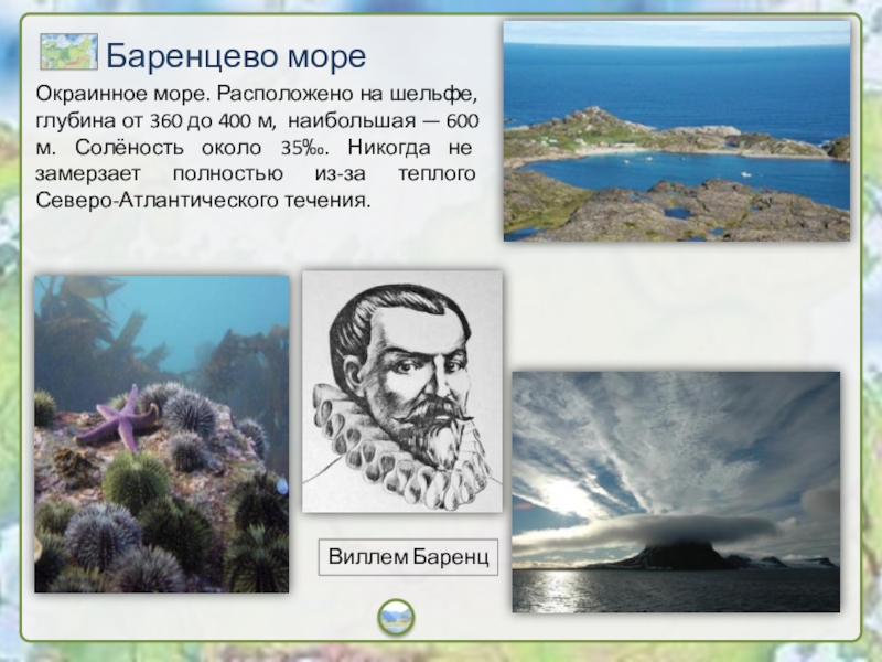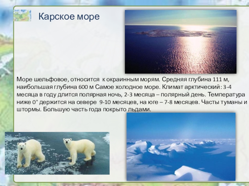 Моря Северного Ледовитого океана располагаются в шельфовой зоне. Климат почти всех морей очень суровый, кроме Баренцевого моря, в которое поступают воды теплого Северо - Атлантического течения. Большинство морей 8 — 10 месяцев скованы льдом.