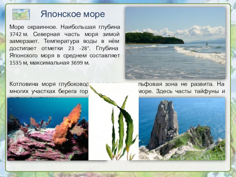 Котловина моря глубоководная впадина, шельфовая зона не развита. На многих участках берега горы обрываются в море. Здесь часты тайфуны и сильные штормы.