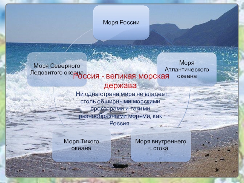 Территорию России омывают 12 морей, принадлежащих бассейнам 3 океанов и 1 море бассейна внутреннего стока