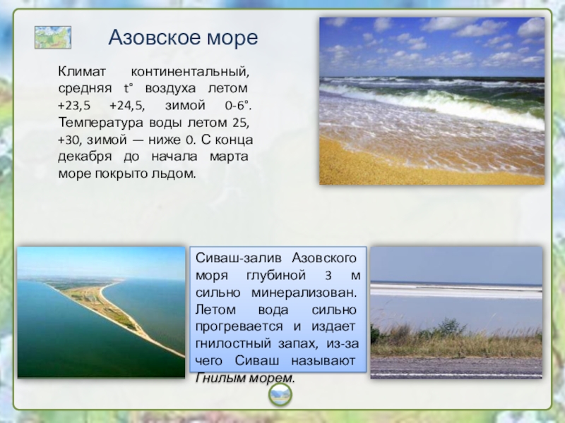 Сиваш-залив Азовского моря глубиной 3 м сильно минерализован. Летом вода сильно прогревается и издает гнилостный запах, из-за чего Сиваш называют Гнилым морем.