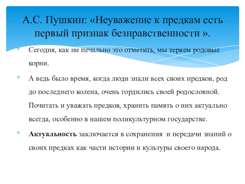 А.С. Пушкин: «Неуважение к предкам есть первый признак безнравственности ».