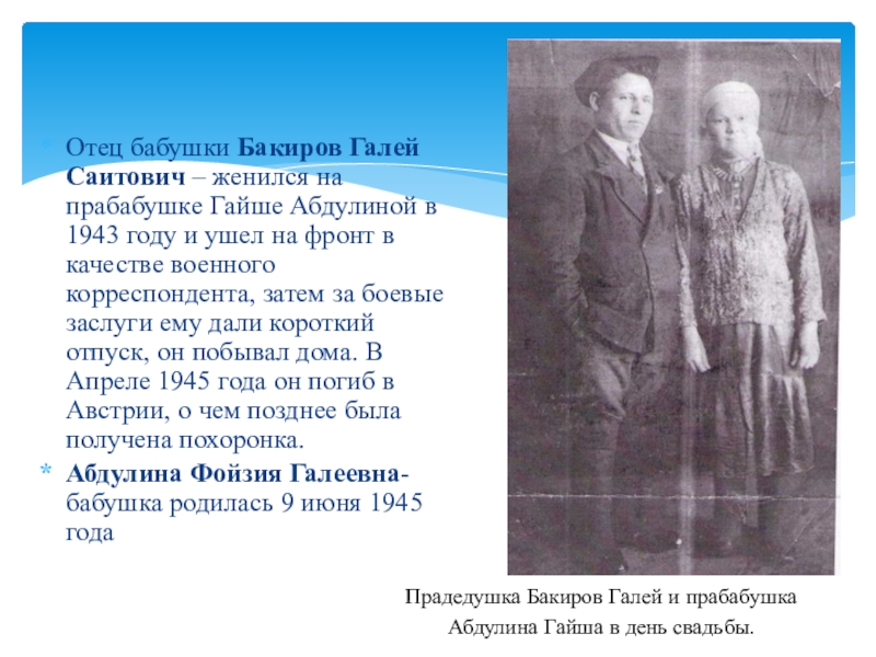 Прадедушка Бакиров Галей и прабабушка Абдулина Гайша в день свадьбы.