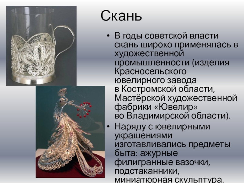 В годы советской власти скань широко применялась в художественной промышленности (изделия