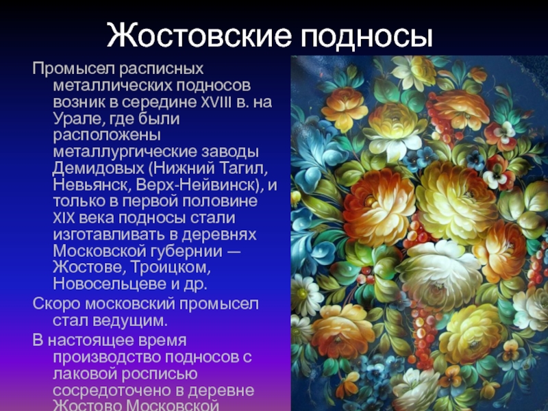 где были расположены металлургические заводы Демидовых (Нижний Тагил, Невьянск, Верх-Нейвинск), и только в первой половине XIX века подносы стали изготавливать в деревнях Московской губернии — Жостове, Троицком, Новосельцеве и др.