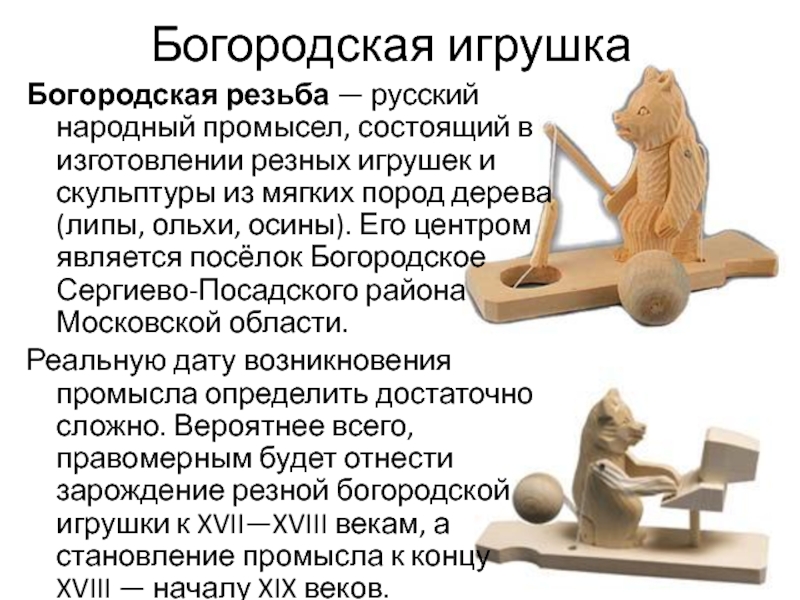 Богородская резьба — русский народный промысел, состоящий в изготовлении резных игрушек