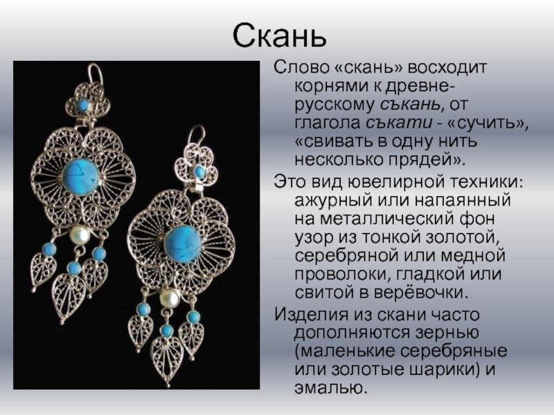 Изделия из скани часто дополняются зернью (маленькие серебряные или золотые шарики) и эмалью.