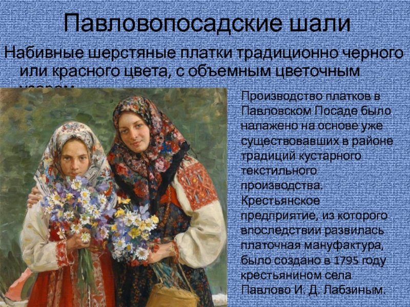 Крестьянское предприятие, из которого впоследствии развилась платочная мануфактура, было создано в 1795 году крестьянином села Павлово И. Д. Лабзиным.