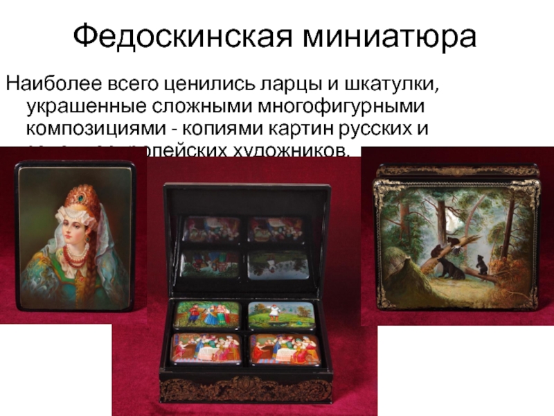 Излюбленными мотивами росписи федоскинских миниатюристов стали популярные в то время