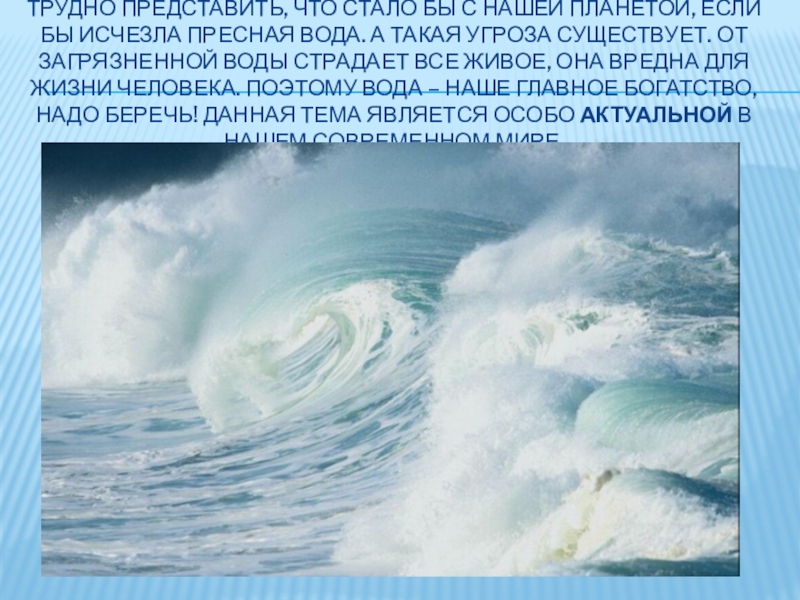 пресная вода. А такая угроза существует. От загрязненной воды страдает все живое, она вредна для жизни человека. Поэтому вода – наше главное богатство, надо беречь! Данная тема является особо актуальной в нашем современном мире.