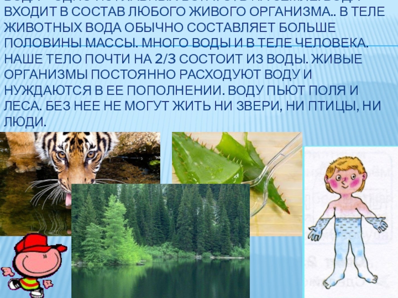состав любого живого организма.. В теле животных вода обычно составляет больше половины массы. Много воды и в теле человека. Наше тело почти на 2/3 состоит из воды. Живые организмы постоянно расходуют воду и нуждаются в ее пополнении. Воду пьют поля и леса. Без нее не могут жить ни звери, ни птицы, ни люди.