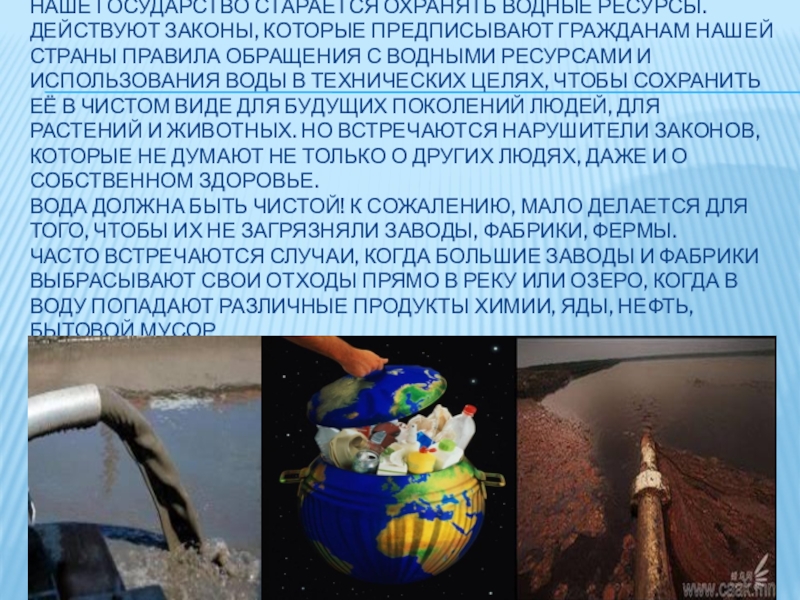 Слайд 3Наше государство старается охранять водные ресурсы. Действуют законы, которые предписывают гражданам