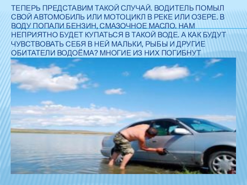 реке или озере. В воду попали бензин, смазочное масло. Нам неприятно будет купаться в такой воде. А как будут чувствовать себя в ней мальки, рыбы и другие обитатели водоёма? Многие из них погибнут