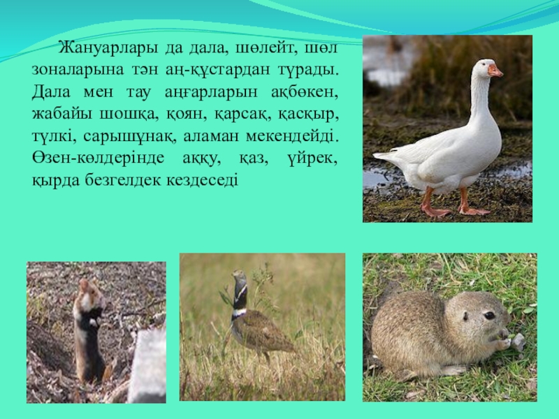 Слайд 17Жануарлары да дала, шөлейт, шөл зоналарына тән аң-құстардан түрады. Дала мен