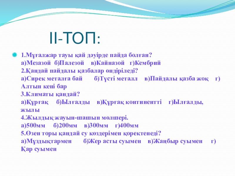 а)Сирек металға бай б)Түсті металл в)Пайдалы қазба жоқ г)Алтын кені бар