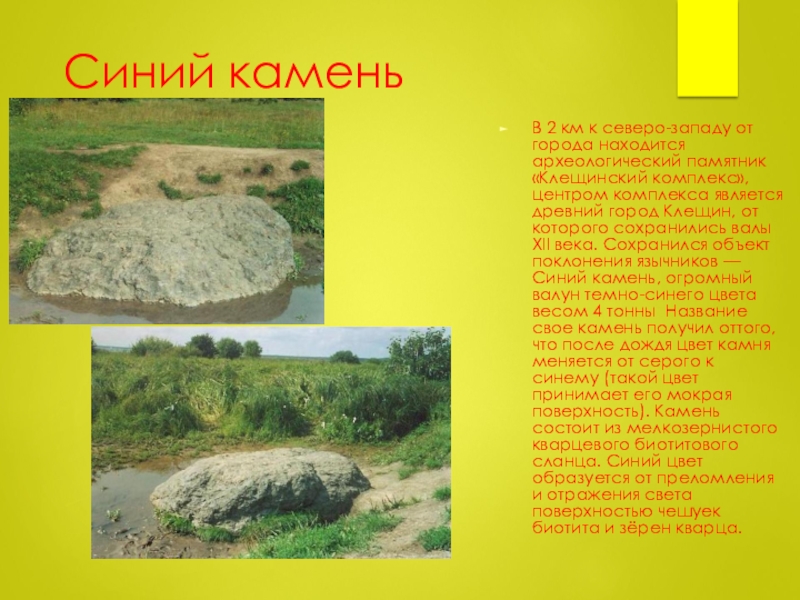 «Клещинский комплекс», центром комплекса является древний город Клещин, от которого сохранились валы XII века. Сохранился объект поклонения язычников — Синий камень, огромный валун темно-синего цвета весом 4 тонны  Название свое камень получил оттого, что после дождя цвет камня меняется от серого к синему (такой цвет принимает его мокрая поверхность). Камень состоит из мелкозернистого кварцевого биотитового сланца. Синий цвет образуется от преломления и отражения света поверхностью чешуек биотита и зёрен кварца.