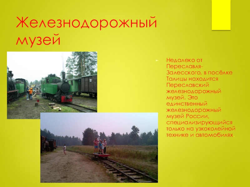 Железнодорожный музейНедалеко от Переславля-Залесского, в посёлке Талицы находится Переславский железнодорожный музей. Это единственный железнодорожный музей России, специализирующийся
