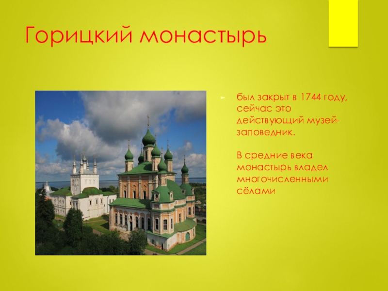 Горицкий монастырь был закрыт в 1744 году, сейчас это действующий музей-заповедник.   В средние века монастырь владел