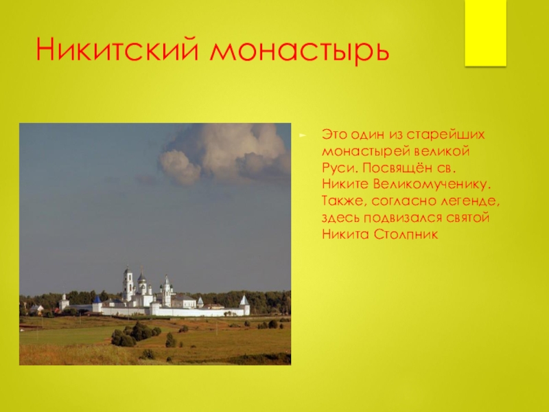 Никитский монастырьЭто один из старейших монастырей великой Руси. Посвящён св. Никите Великомученику. Также, согласно легенде, здесь подвизался