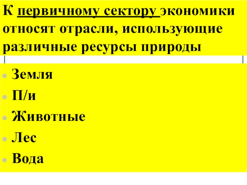 К первичному сектору экономики относят отрасли, использующие различные ресурсы природыЗемляП/иЖивотныеЛесВода